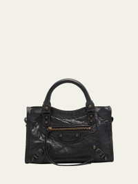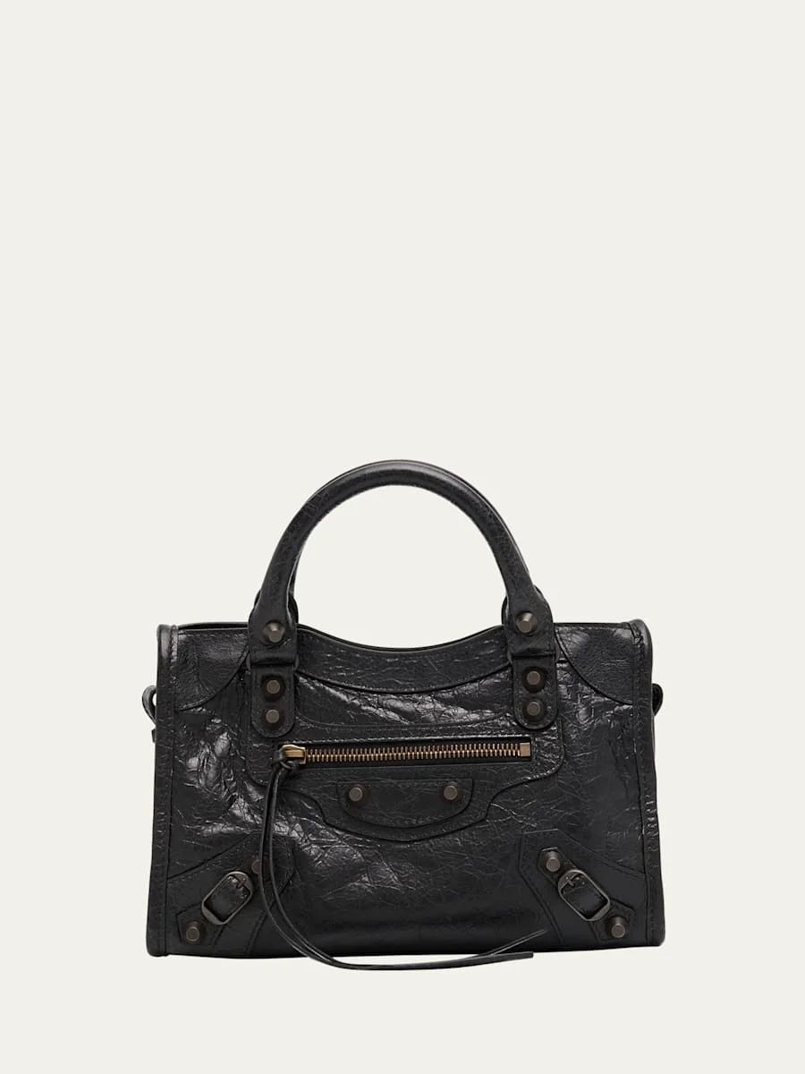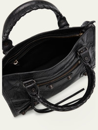 Balenciaga "Le City" top handle bag in crinkled lamb leather Rolled top handles Detachable, adjustable shoulder/crossbody strap Can be worn as a top handle or shoulder/crossbody bag Zip top closure Exterior, front zip pocket Interior, one zip pocket Approx. 6.3"H x 9.4"W x 2.5"D Wipe clean Made in Italy