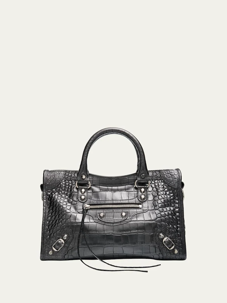 This "Le City" tophandle bag from Balenciaga is crafted in rich crocembossed leather, detailed with stitching, studs, and buckle accents Braided rolled top handles, 3.9" drop Detachable, adjustable shoulder strap, 21.6" drop Can be worn as a top handle or shoulder bag Zip top closure Exterior, one zip pocket Interior, one zip pocket Lining: Cotton Approx. 7.5"H x 11.8"W x 3.8"D Made in Italy