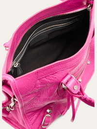 Balenciaga "Le City" top handle bag in crinkled lambskin leather Rolled top handles Detachable, adjustable shoulder strap Can be worn as a top handle or shoulder bag Zip top closure Exterior, front zip pocket Interior, one zip pocket Approx. 7.5"H x 11.8"W x 3.9"D Made in Italy