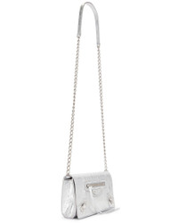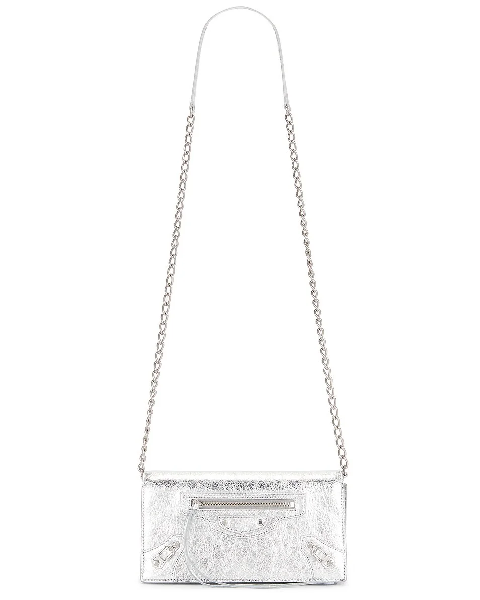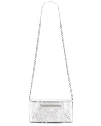 Details - Metallic lambskin exterior with smooth leather lining - Made in Italy - Flaptop with magnetic snap button closure - One main compartment - Exterior zipper pocket - 6 interior card slots - Silver-tone brass hardware - Measures approx 19 cm W x 10 cm H x 2 cm D - Adjustable shoulder strap with a 74 cm drop - Our Style No. BALF-WY1547 - Manufacturer Style No. 819472-2ABMY-8122