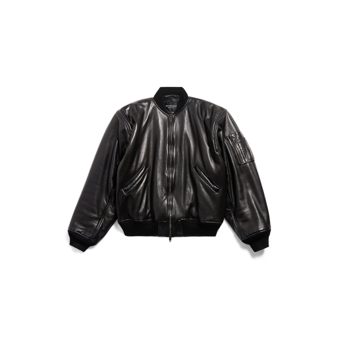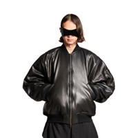Bomber Leather Jacket in black soft lambskin PRODUCT DETAILS • Soft lambskin • This item is unisex • Double-ended zip fastening • Leather tab zipper puller • Cargo pocket on left sleeve • 2 slash pockets at front • Ribbed trims • Made in Italy Main material: 100% lambskin - Lining: 100% cupro - Padding: 60% silk, 40% polylactide - Trimming: 100% cotton - Contains non-textile parts of animal origin