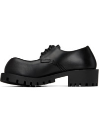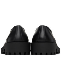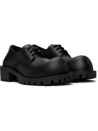 Polished calfskin derbys in black. · Lace-up closure · Rubber block heel · Treaded rubber sole · Heel: H2" Supplier color: Black