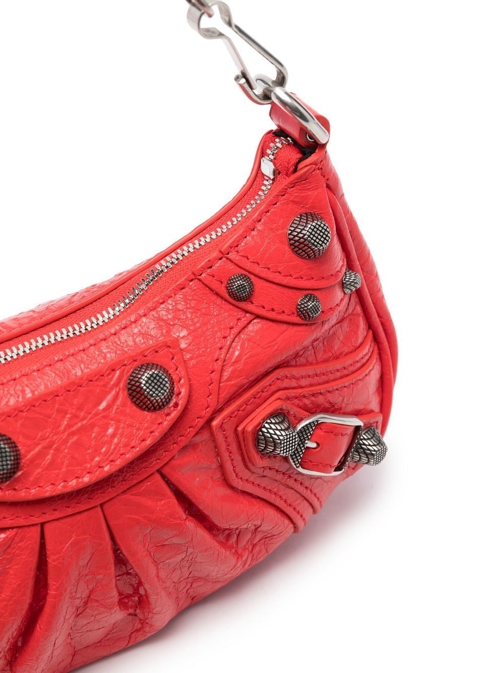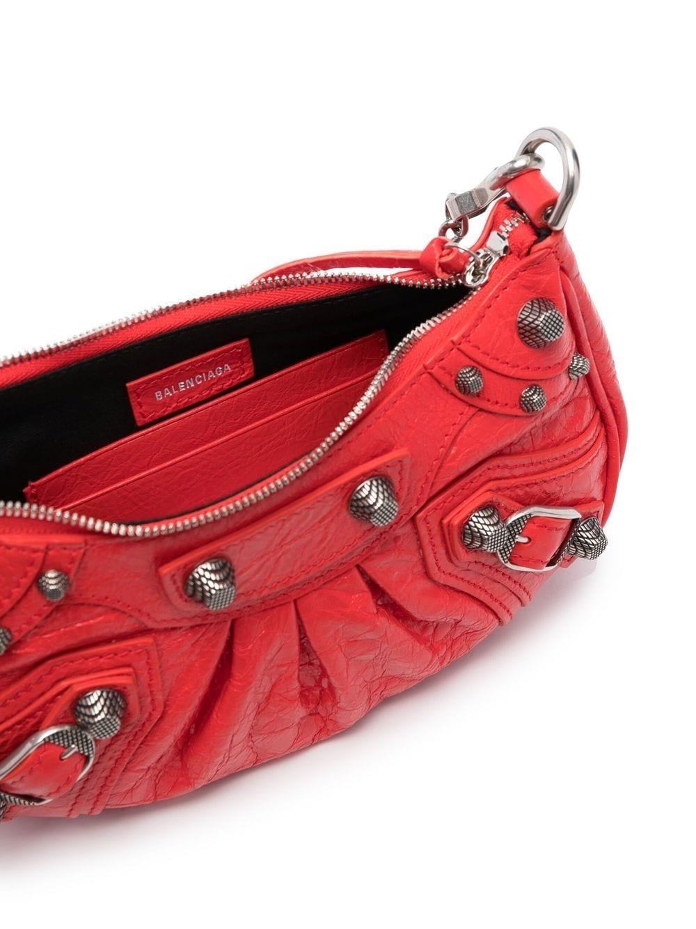 leather stud-detail shoulder bag leather stud-detail shoulder bag from BALENCIAGA featuring cardinal red, calf leather, silver-tone hardware, stud detailing, detachable chain-link shoulder strap, top zip fastening, main compartment and internal card slots. Conscious: We've partnered with Good On You â an ethical agency that rates how sustainably brands perform. This item comes from a brand that performs well in relation to their impact on the planet.. Imported Composition Outer: Calf Leather 100% SIZE & FIT Model measurements Height 5 ft 10 in(1.77 m) Bust/Chest 30.31 in(77 cm) Hips 35.03 in(89 cm) Waist 22.83 in(58 cm) Measurement DEPTH 1.96 in(5 cm) HANDLE 8.26 in(21 cm) HEIGHT 3.93 in(10 cm) STRAP 20.07 in(51 cm) WIDTH 7.87 in(20 cm)