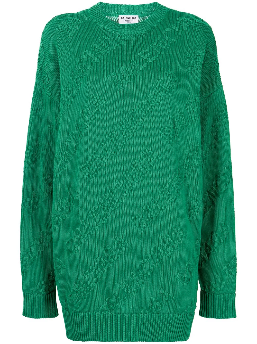 logo-intarsia oversized jumper Balenciaga continues its love of branding, stamping pieces with the label's signature bold logo motifs. Knitted from cotton in bright green, this oversized jumper is detailed with all-over tonal logo intarsia that subtly draws attention without demanding it. Made in Italy Composition Cotton 100% Washing instructions Dry Clean Only
