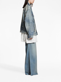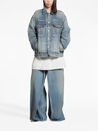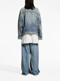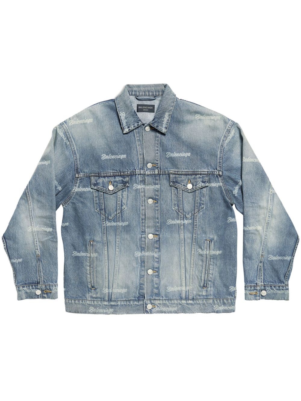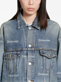 logo-print denim jacket Balenciaga’s denim jacket is distinguished by the all-over cursive lettering print: a nod to the brand’s penchant for logomania. The faded wash evokes a signature love-worn aesthetic. Highlights - Light blue - Cotton - Washed denim - Faded effect - All-over logo print - Straight-point collar - Front button placket - Drop shoulder - Buttoned-cuff sleeves - Two button-fastening chest pockets - Two side slit pockets - Straight hem - We've partnered with good on you — an independent agency that rates how brands perform in relation to their impact on the planet, people and animals, with a multi-criteria rating simplified to a five points scale. in order to be awarded our conscious label, larger brands need to score a minimum of four out of five ('good'), while smaller brands must score at least three out of five ('it's a start'). - This item comes from a brand rated four out of five ('good') by good on you. please note, this is a brand-level rating and does not guarantee that this product is made with conscious materials. - Learn more about what makes a product conscious on our conscious criteria page Imported Composition Cotton 100%
