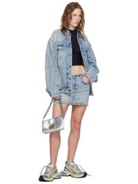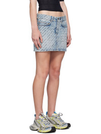Non-stretch denim skirt. Fading, distressing, and logo pattern printed throughout. · Belt loops · Five-pocket styling · Zip-fly · Logo patch at back waistband · Logo-engraved bronze-tone hardware · Contrast stitching in tan Supplier color: Iced blue