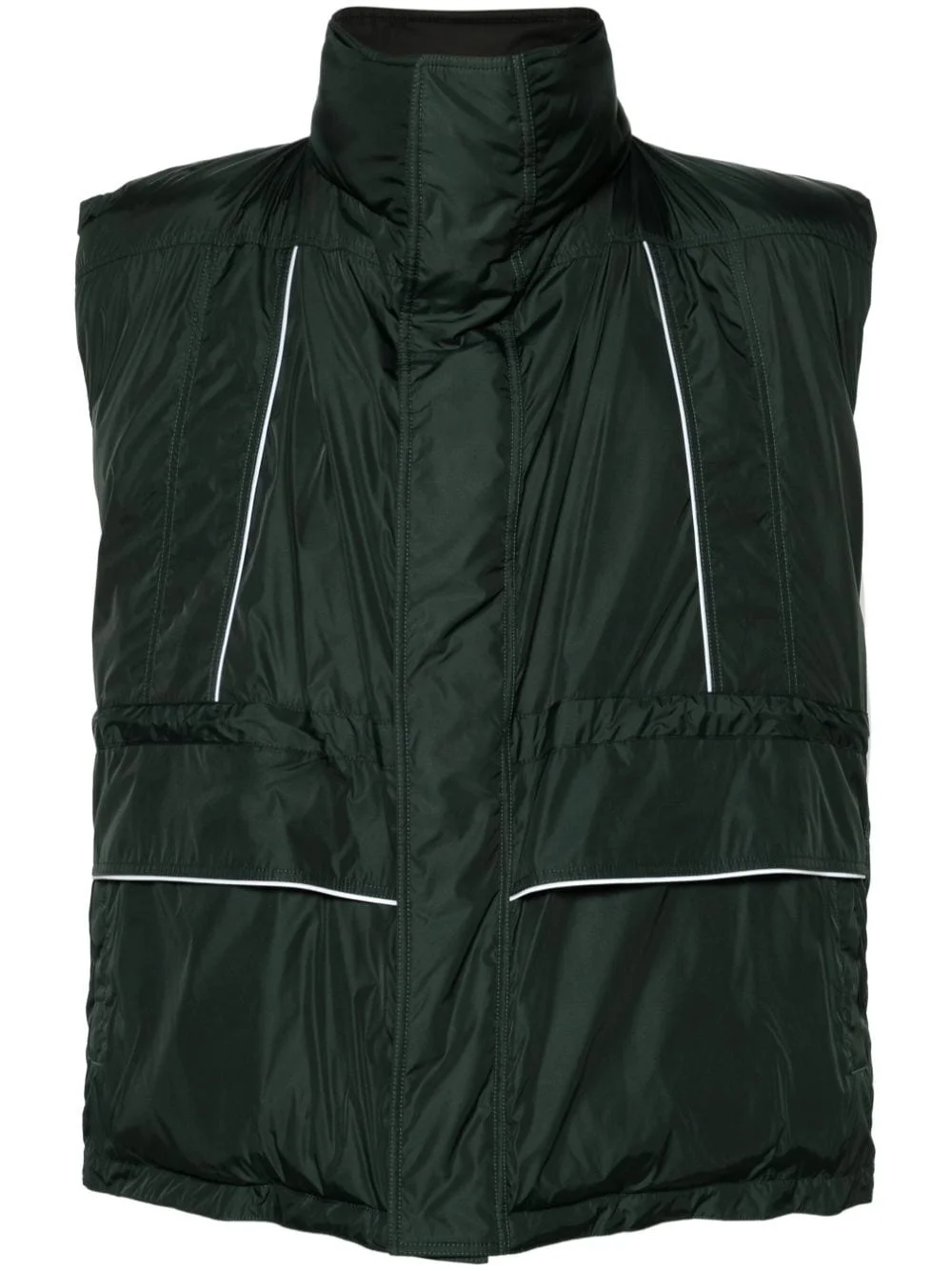 logo-print puffer vest Imagined in a deep green hue for AW23, this vest from Balenciaga is defined by the voluminous padded silhouette. The brand's logo is printed at the neckline for a subtle signature touch. Highlights - Forest green - Padded design - Logo print at the neckline - Reflective detailing - Stand-up collar - Front press-stud and zip fastening - Sleeveless - Internal drawstring fastening waist - Two zip-fastening pockets - Straight hem - Full lining - When buying this unisex item, keep in mind that it is graded in standard men's sizing. Made in Italy Composition Lining: Polyester 100%, Polyamide 100%, Silk 60%, Polylactic Acid (PLA) 40% Outer: Polyamide 100%, Polyester 100% SIZE & FIT Model measurements Height 5 ft 10 in(1.78 m) Bust/Chest 33.07 in(84 cm) Hips 36.61 in(93 cm) Waist 24.8 in(63 cm) FittingInformation This unisex piece is designed for an oversized fit whether you usually select women's or men's sizes Adjust this piece’s waistband to your preference using the drawstring Made from a padded non-stretch fabric, giving it no natural elasticity