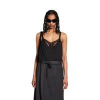 Patched Slip Dress in black technical georgette is from look 42 of Balenciaga Spring 25 Collection. PRODUCT DETAILS • Mix material • Long dress • 2 panels assembled together: A lingerie top with lace and a tailoring skirt • V-neck top • Sleeveless • Asymmetric shoulder straps • Large and long slit at skirt back • 1 skirt front button • Belt loops with thin black lace strap • 2 back piped pockets • Ankle length • Made in Italy Main material 1: 55% polyester, 45% wool