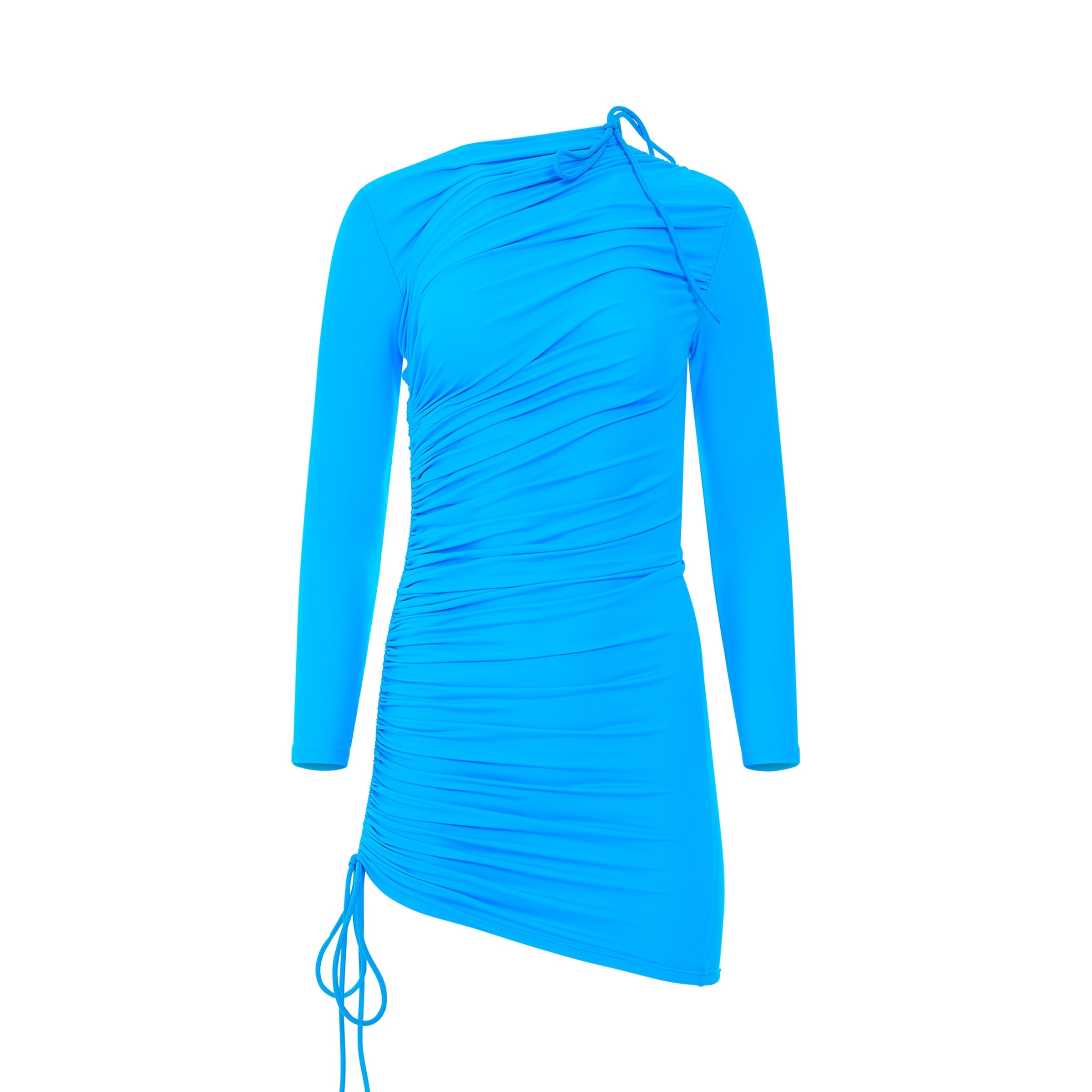Long sleeves mini matte spandex dress in cyan with stretch-design, gathered detailing, adjustable fit and round neck - Composition: 80% Polyamide, 20% Elastane - Stretch-design - Gathered detailing - Adjustable fit - Round neck - Long sleeves - Thigh-length - Drawstring detailing SKU: 704440TYK074960