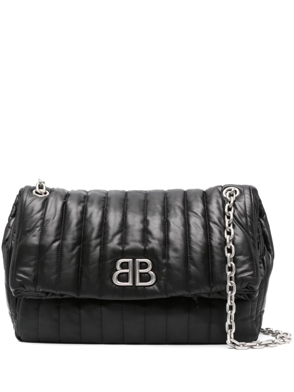 medium Monaco chain-strap quilted shoulder bag Balenciaga's iconic Monaco bag is defined by its quilted silhouette and embossed 'B' logo plaque. It's made in Italy from leather. Highlights - Black - Leather - Quilted - Silver-tone hardware - Silver-tone logo plaque - Chain-link shoulder strap Made in Italy Composition Outer: CALFSKIN 100% Lining: Cotton 100% SIZE & FIT Model measurements Height 5 ft 10 in(1.77 m) Bust/Chest 29.92 in(76 cm) Hips 34.25 in(87 cm) Waist 23.62 in(60 cm) Measurement DEPTH 3.9 in(9.9 cm) HEIGHT 8.69 in(22 cm) WIDTH 12.8 in(32.5 cm) HANDLE 10.2 in(25.9 cm)