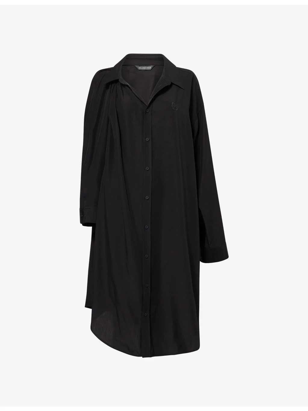 PRODUCT DETAILS - Balenciaga woven shirt dress - 100% TENCEL™ lyocell; embroidery 100% polyester - Exposed button fastenings at front - Relaxed fit, spread collar, one-shoulder design, dropped shoulders, long sleeves, buttoned cuffs, logo embroidered at chest, mini length - Dry clean - Made in Italy - True to size - Size UK 8: length 41in / 104cm - Model is 5ft 10in/1.78m and wears a size UK 8 - Lightweight, non-stretch Ref: R04498088