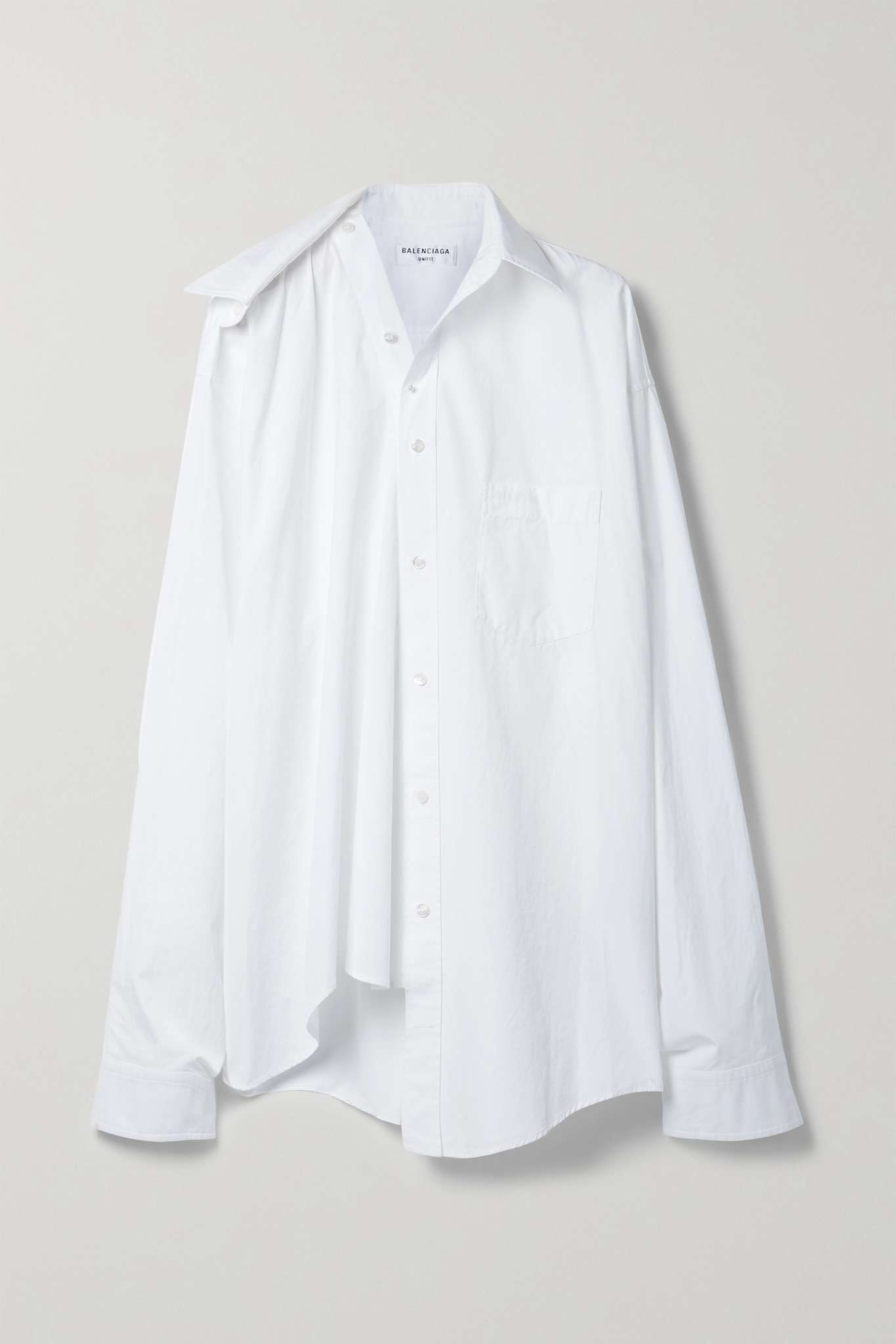 EDITORS'NOTES Balenciaga knows how to do classic tailoring in an unconventional way that's unique yet characteristic to the brand. This cotton-poplin shirt is designed in an oversized silhouette with an uneven hem and unexpected, asymmetric collar. Wear it untucked from jeans or wide-leg pants to play up the proportions. SIZE & FIT - Fits true to size, take your normal size - Intended for an oversized fit, cut to be worn very loose - Lightweight, non-stretchy fabric - Model is 177cm/ 5'10" and is wearing a size Small DETAILS & CARE - White cotton-poplin - Button fastenings through front - 100% cotton - Machine wash
