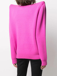 Pagoda Turtleneck in bright pink ribbed knit PRODUCT DETAILS Composition: 95% Virgin Wool, 4% Polyamide, 1% Elastane - Ribbed knit - Turtleneck - Pagoda shoulders - Exaggerated removable sleeve heads - Elasticated cuffs - Made in Italy - Dry cleaning - Model is 180 cm / 5’11” and is wearing FR size S