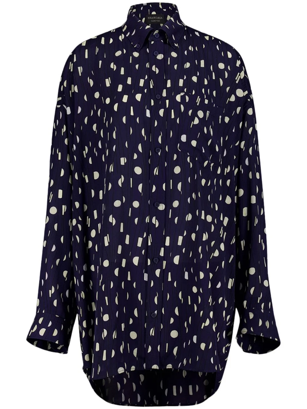 painted pleated shirt Highlights - Navy blue - White - Polka dot print - Pleat detailing - Front button fastening - Classic collar - Long sleeves - Chest patch pocket - Buttoned cuffs - High-low hem Made in France Composition Polyester 100%