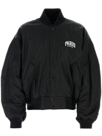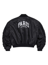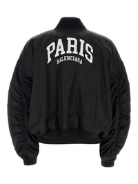 Paris oversized bomber jacket Balenciaga pays homage to its current base with this Paris logo bomber jacket. It's cut to a statement oversized silhouette and printed with the signature logo lettering in contrasting white. Highlights - Black - Logo print at the chest - Logo print to the rear - Round neck - Front zip fastening - Long sleeves - Elasticated cuffs - Elasticated hem - When buying this unisex item, keep in mind that it is graded in standard men's sizing. Made in Italy Composition Lining: Cupro 100% Outer: Nylon 100% SIZE & FIT Measurement CHEST 48.81 in(124 cm) SLEEVE LENGTH 27.16 in(69 cm) LENGTH 26.37 in(67 cm) WAIST 57.48 in(146 cm) Washing instructions Read Manufacturer Guidelines
