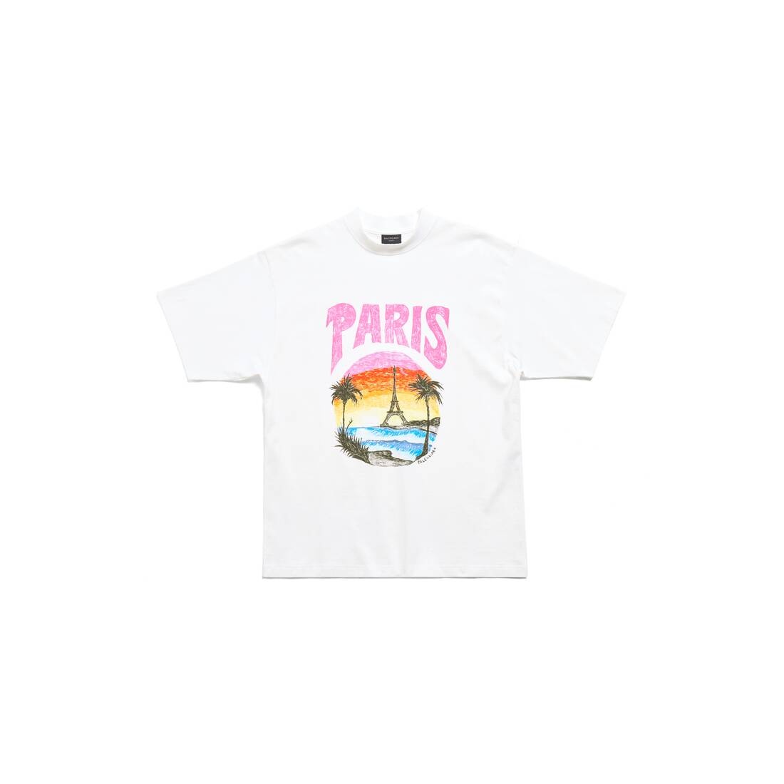 Paris Tropical T-Shirt Medium Fit in white and pink vintage jersey PRODUCT DETAILS • Vintage jersey • This item is unisex • Medium fit • Crewneck • Short sleeves • Paris tropical artwork printed at front and back • Made in Portugal • Cold machine wash • Model is 177 cm / 5'10" and is wearing a size S Material: 100% cotton