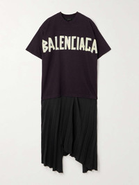 EDITORS'NOTES Balenciaga's dress is inspired by the humble streetwear tee. The top half is cut from cotton-jersey and printed with the logo in tape-like font. It's joined with an asymmetric crepe midi skirt, defined by sharp pleats. SIZE & FIT Model measurements: - Fits true to size, take your normal size - Designed for a relaxed fit - Mid-weight, slightly stretchy fabric with non-stretchy panels - Model is 177cm/ 5'10" and is wearing a FR 36 - Bust: 82cm/ 32.5" - Waist: 66cm/ 26" - Hip: 90cm/ 35.5" DETAILS & CARE - Black, light-yellow and yellow cotton-jersey, black crepe - Slips on - Fabric1: 100% cotton; fabric2: 100% polyester - Hand wash