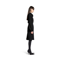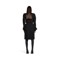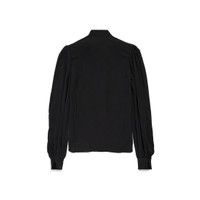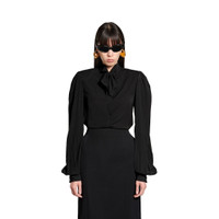 Bow Blouse in black fluid technical crepe is from look 37 of Balenciaga Spring 25 Collection. PRODUCT DETAILS • Fluid technical crepe • Bow at collar • Rounded shoulders and sleeves • Buttoned front • Rounded hem • Buttoned cuffs • Made in Italy Main material: 100% polyester