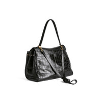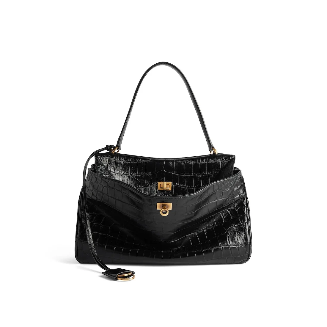 Rodeo Handbag Medium in black supple crocodile embossed calfskin, aged-gold hardware PRODUCT DETAILS • Dimensions: L13,8 x H9,2 x W4,3 inch • Supple crocodile embossed calfskin • Handbag • One handle (drop: 8,1 inch) • Removable shoulder strap (drop: 22,6 inch) • Removable cloche cles with two split rings • Aged-gold hardware • Turn lock closure • Wide front pocket • 1 main compartment • 1 inner zipped pocket • 2 flat pockets at back • Side snaps • 4 brass feet • Nappa lambskin lining • Made in Italy Material: calfskin