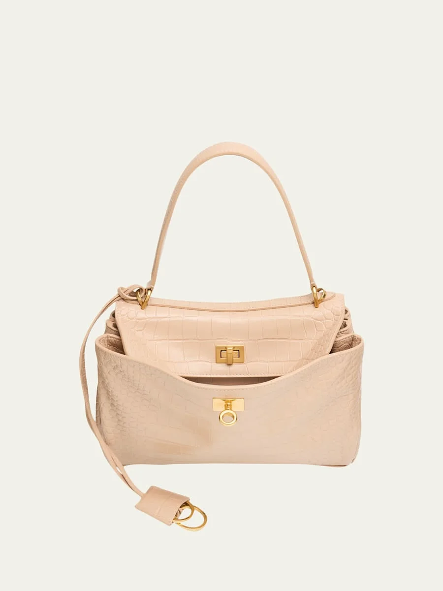This Balenciaga "Rodeo" tophandle bag is crafted in crocembossed leather and allows for versatile styling with side snaps and adjustable flap top Flat top handle Detachable shoulder strap Can be worn as a top handle or shoulder bag Flap top with turnlock closure Side gussets with snaps Detachable cloche cles with two split rings Exterior, two back slip pockets Divided interior, one zip pocket Feet protect the bottom of the bag Approx. 7.9"H x 10.6"W x 3.9"D Made in Italy