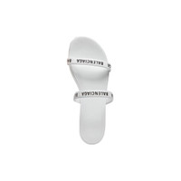 Round Flat Sandal in white and black smooth calfskin PRODUCT DETAILS • Smooth calfskin • Flat sandal • Rounded toe • Two straps with one inside elastic • Balenciaga Allover Logo printed on straps • Embossed Balenciaga logo on sole part • Tone-on-tone insole • Made in Italy • Wipe with a soft cloth Material: 100% calfskin
