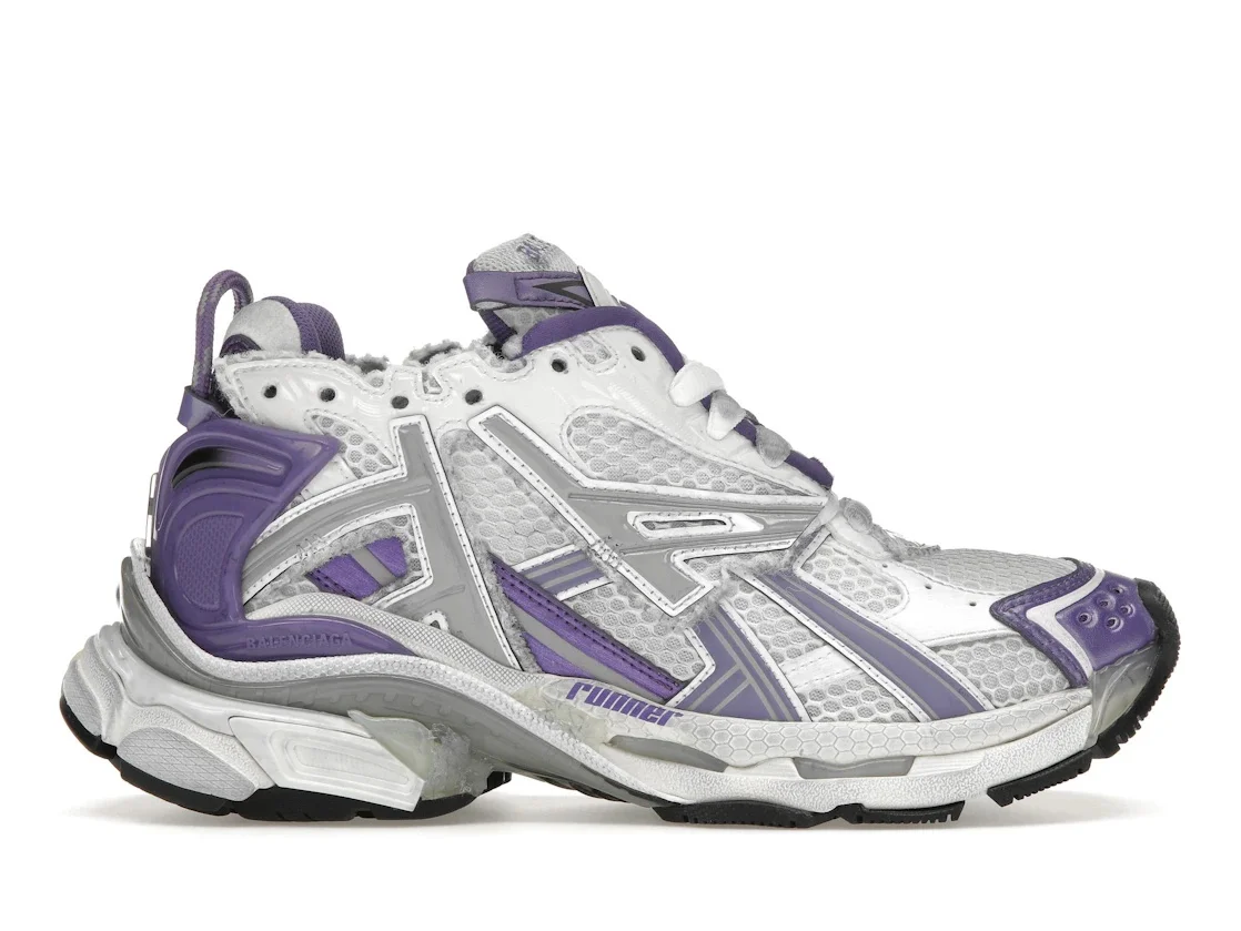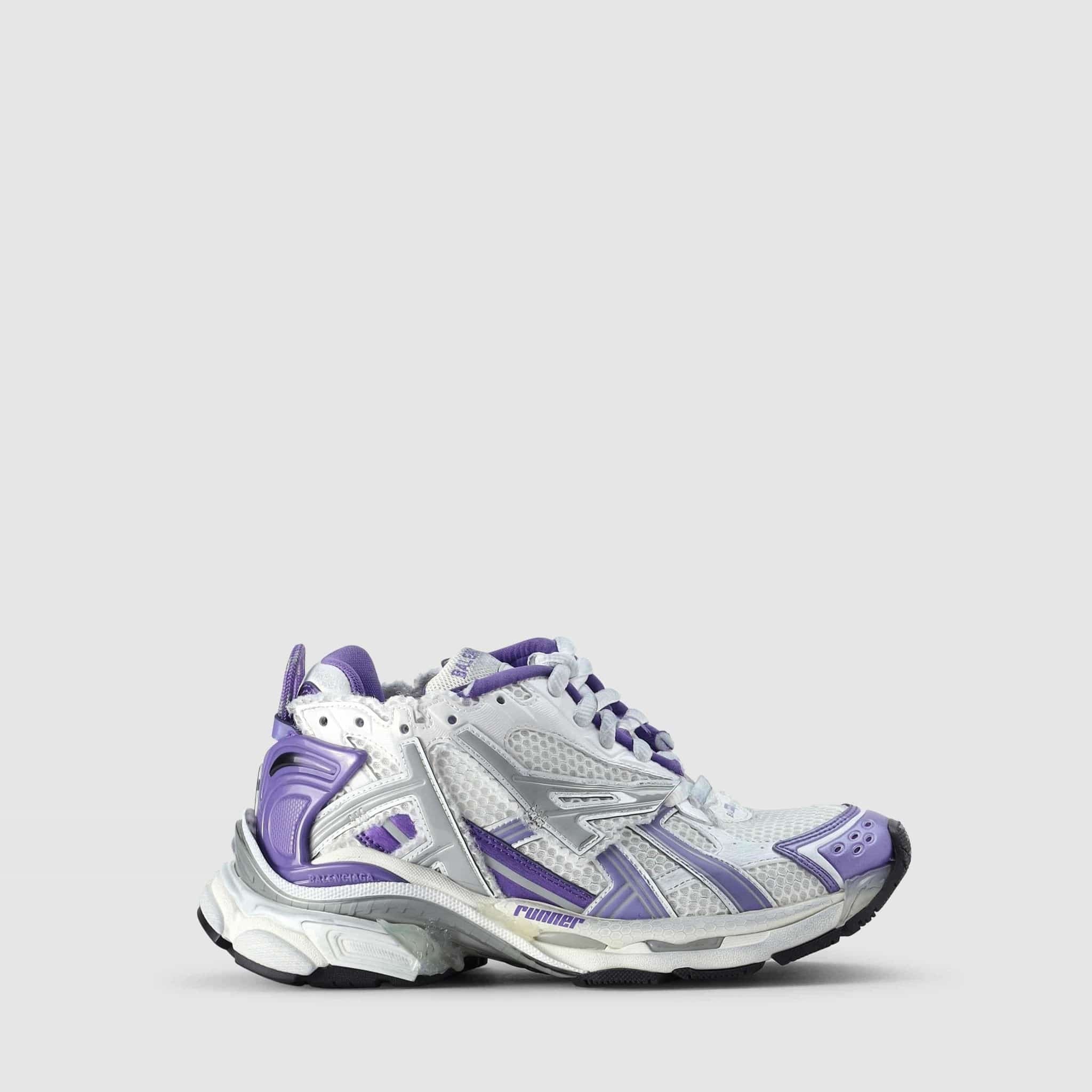 - White/Purple/Grey - Nylon & Mesh - Worn-Out Effect - Multicoloured Sole Bottom - Augmented Back - BALENCIAGA Branding Own a slice of the rainbow and wear it on your feet with BALENCIAGA Women’s Runner Purple Trainer. This nylon and mesh beauty is designed to give a dramatic effect and can be worn with a colour block outfit to really show it off. The bottom of the sole sports the same multicoloured patterns, and the augmented back is best to propel you forward into good times. Signature BALENCIAGA branding is seen throughout. Fits true to size, take your normal size.