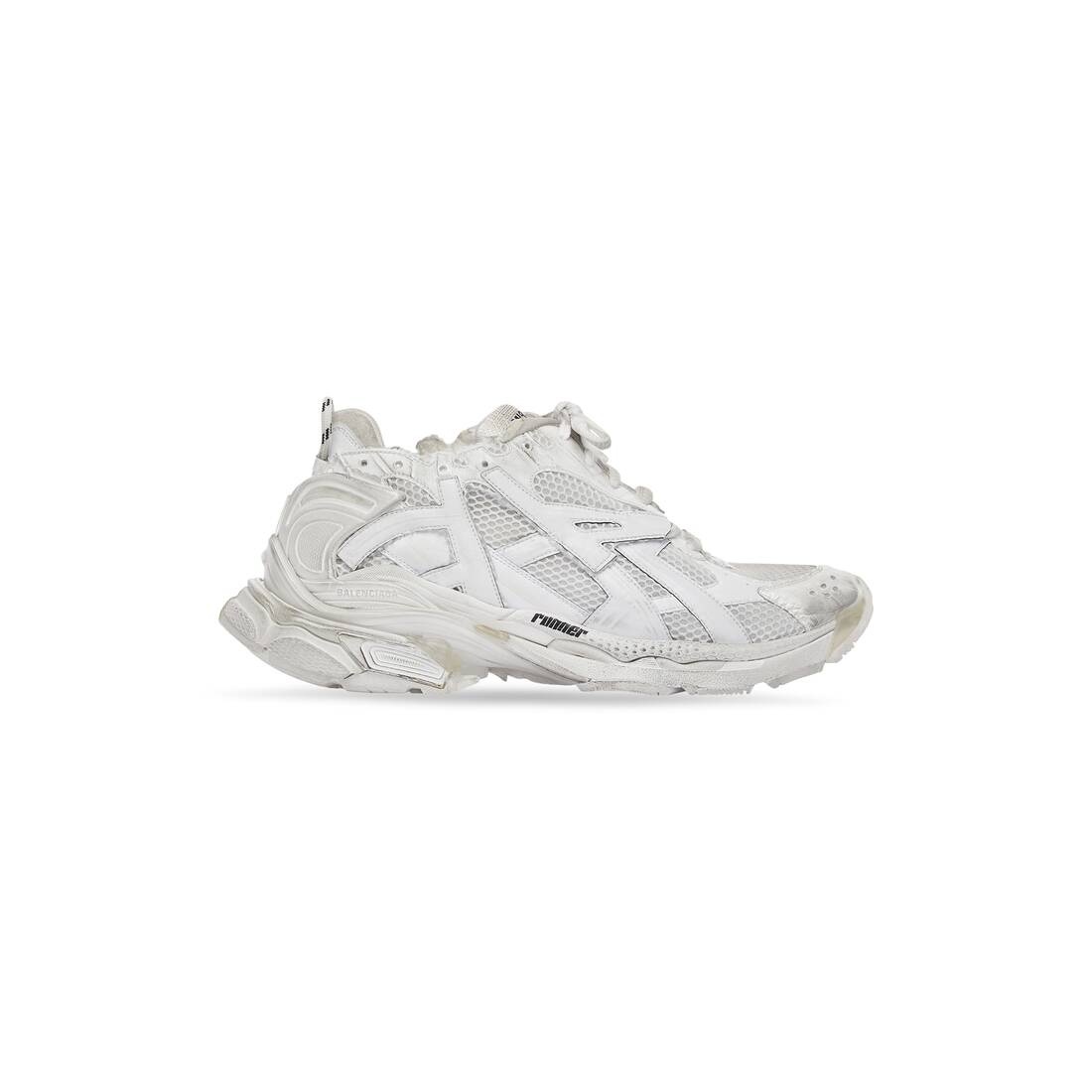 Runner Sneaker in white mesh and nylon PRODUCT DETAILS • Leather free • Sneaker • Mesh and nylon • Worn-out effect • Printed size at the edge of the toe • Embossed size at back • Runner logo printed on exterior • Balenciaga logo embroidered on the tongue • Balenciaga logo at the back of the heel • Back pull-on tab • Made in Italy • Wipe with a soft cloth Material: 70% polyester, 30% polyurethane