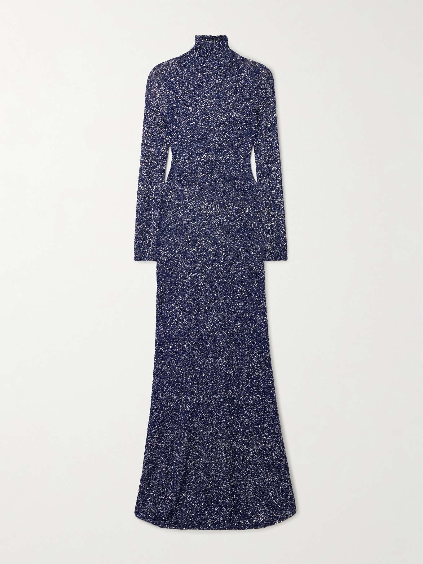EDITORS'NOTES Balenciaga’s turtleneck maxi dress is nothing short of show-stopping. It’s been knitted in Italy from metallic threads and saturated with sparkling sequins that catch light from every angle. SIZE & FIT Model measurements: - Fits true to size, however those who are between sizes should take the larger size - Designed for a close fit - Short in the sleeves - Mid-weight, stretchy fabric - Model is 177cm/ 5'10" and is wearing a size Small - Bust: 79cm/ 31" - Waist: 61cm/ 24" - Hip: 89cm/ 35" DETAILS & CARE - Navy metallic polyamide - Slips on - 100% polyamide - Dry clean
