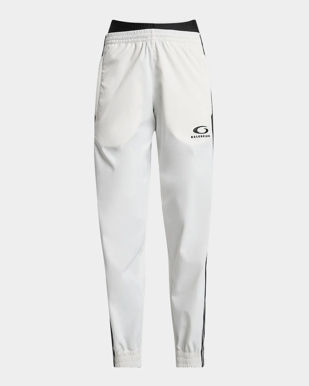 - Balenciaga tracksuit pants featuring sport logo embroidered hip, five-striped sides, and an elasticized waistband - Mid rise sits high on hip - Tapered legs - Full length - Smocked cuffed hem with side zips - Pull-on style - Polyester - Dry clean, professional cleaning recommended - Made in Italy