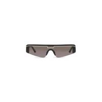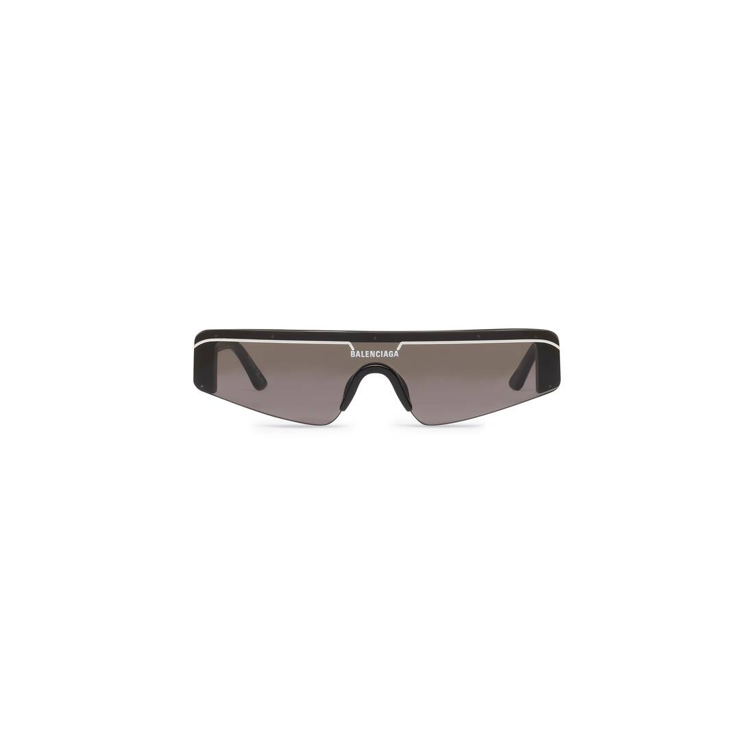 Ski Rectangle Sunglasses in black acetate with black lenses PRODUCT DETAILS • Temple length : 5,5 inch • Bridge width : 0,04 inch • Narrow flat top rectangle shaped mask • Standard fit • Flat full lens modern frontal on acetate construction • White enamelled stripe on top bar with logo on center-front of the frame • Laser engraved and enamelled logo on the left end tip • Lens Category 2 • 100% UVA/UVB protection • Made in Italy • Wipe with a soft cloth • BB0003S 001 Material: 100% acetate