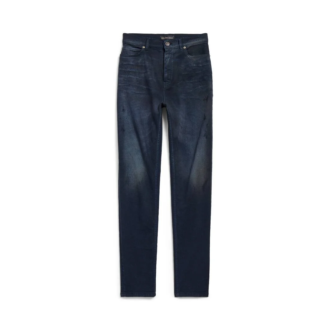 Skinny Pants in navy and dirty dark blue cotton denim PRODUCT DETAILS • Cotton denim • High-waist • Covered zip fly • 5 pockets • 5 belt loops • Balenciaga Jeans patch at back • Washed and worn-out effect • Made in Italy Main material: 98% cotton, 2% elastane
