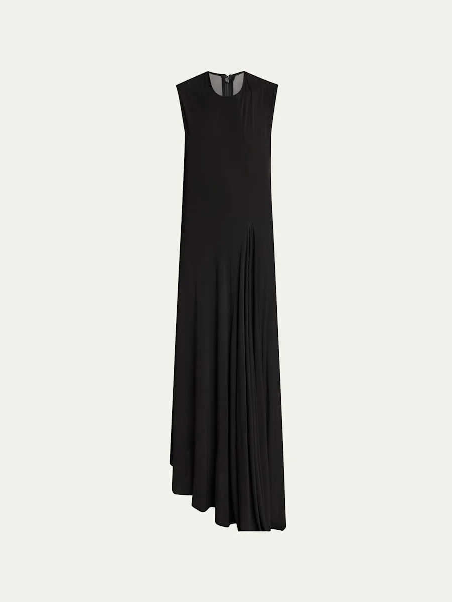 Balenciaga asymmetric dress featuring a side godet Round neckline Sleeveless Full length A-line silhouette Invisible back zip Viscose/elastane Hand wash, machine wash line dry Made in Portugal Online Inquiries: BGS21_BA8BK| Store Inquiries: #5051749