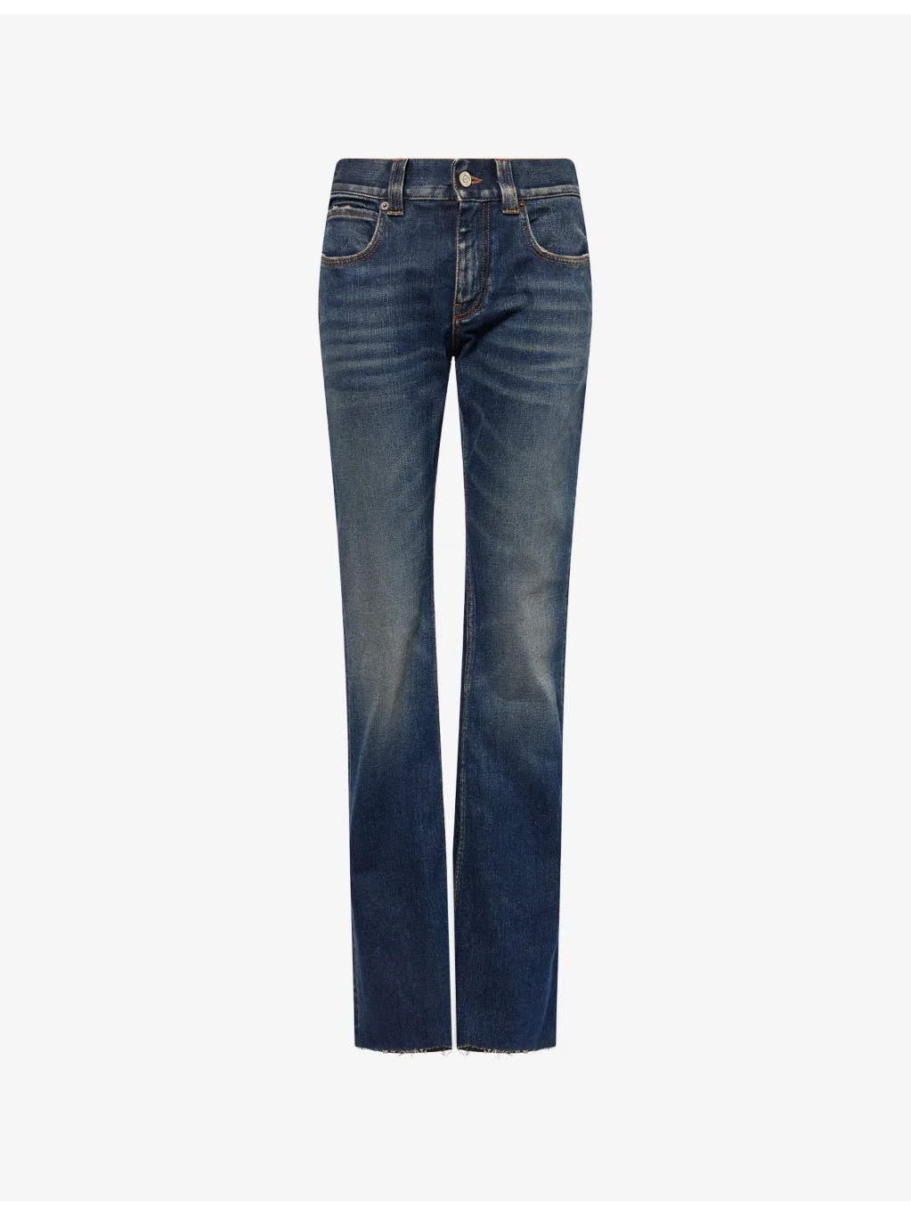 PRODUCT DETAILS - Balenciaga denim jeans - 99% cotton, 1% elastane; pocketlining 65% polyester, 35% cotton - Exposed button and concealed zip-fly fastening at front - Regular fit, mid-rise, bootcut leg, structured waistband with belt loops, five pockets, contrast stitching, branded silver-toned buttons, whiskering, logo patch embroidered at back, frayed hems - Machine wash at 30°C - Made in Italy - True to size - Size 26: rise 11.5in / 29cm, inside leg 35in / 89cm, leg opening 19in / 48cm - Model is 5ft 10in/1.78m and wears a size 26 - Midweight, non-stretch Ref: R04498086