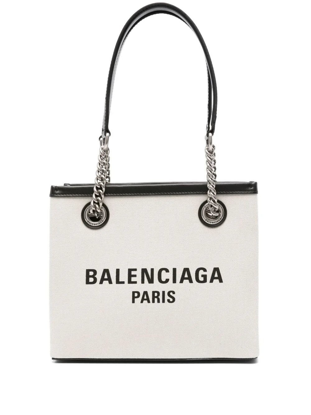 small Duty Free tote bag Presented in small size, Balenciaga's Duty-Free bag features a structured canvas silhouette accentuated with a contrasting logo. It is suspended from two leather and chain-link handles, offering ample space in its main compartment. Highlights - Light beige/black - Canvas - Leather trim - Logo print to the front - Logo-engraved eyelet detailing - Open top - Two leather and chain-link top handles - Main compartment - Debossed internal logo - Internal zip-fastening pocket - Full lining - Silver-tone hardware - This piece comes complete with a protective dust bag. Made in Italy Composition Outer: Fabric 100%, Calf Leather 100% SIZE & FIT Model measurements Height 5 ft 10 in(1.78 m) Bust/Chest 31.49 in(80 cm) Hips 37 in(94 cm) Waist 23.62 in(60 cm) Measurement DEPTH 4.33 in(11 cm) HANDLE 8.66 in(22 cm) HEIGHT 7.48 in(19 cm) WIDTH 9.05 in(23 cm)