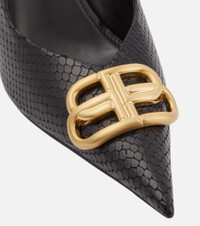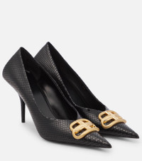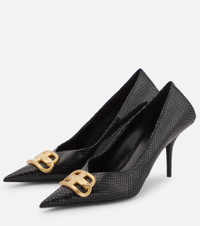 The Square Knife style is a mainstay of Balenciaga’s classic pump design. Made in Italy from croc-effect leather, this pair sits on comfortably low heels, and features squared backs and golden BB hardware at the razor-sharp profiles. Product Details - Lining: leather - Sole: leather insole and sole - Toe shape: pointed toe - Upper: leather - Comes with dust bags - Designer color name: Black/Gold - Comes with a box - Made in Italy - Item number: P00789682 Size & Fit - True to size - Slightly narrow at the heel - Half sizes please take the next size up - European sizes - 9cm-3.5" heel (size EU 38)