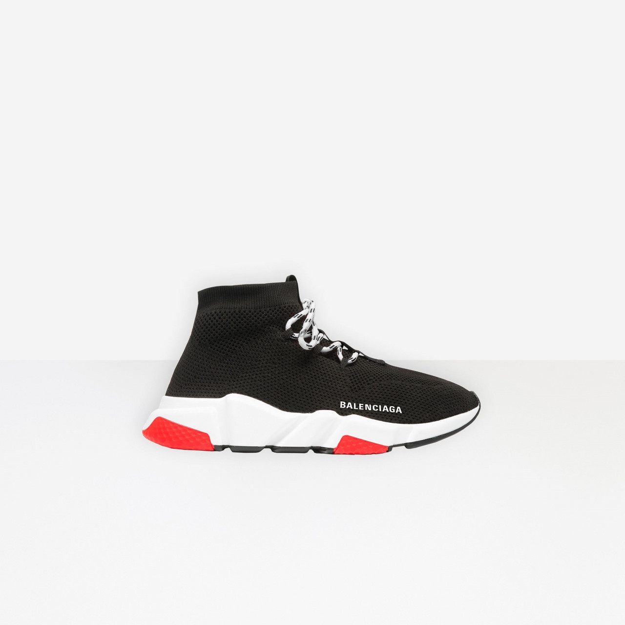 Speed Lace-Up Sneaker in black knit, white, red and black sole unit PRODUCT DETAILS Composition: 80% Polyamide, 20% Elastan - Sock-like design - Technical 3D knit - White, red and black sole - Ultra-flexible molded sole - Ergonomic sole with "No Memory" technology - Extra light: 240g, nearly barefoot feel - Embossed logo on the back of the sole - 10 mm arch - Made in Italy - Do not machine wash, wipe with a soft cloth - The item comes with a Balenciaga dustbag and box
