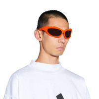 Spike Rectangle Sunglasses in neon orange bio-based injected nylon with grey lenses are from the look 53 of the Balenciaga's Spring 23 Collection, NYC Show. PRODUCT DETAILS • Temple length: 4,1 inch • Bridge length: 0,6 inch • Bio-based injected nylon frame and temples (65% bio-based) • Rectangle shape • Standard fit • Lasered logo on the left lens • Lens material: Nylon • Lens category: 3 • 100% UVA/UVB protection • Not suitable for optical conversion • Made in Italy • Wipe with a soft cloth • BB0255S Material: 100% nylon