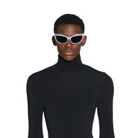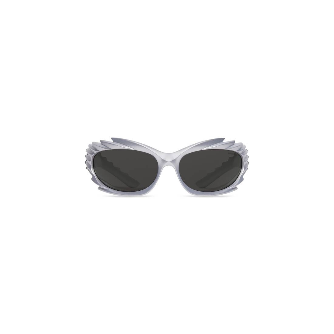 Spike Rectangle Sunglasses in silver bio-based injected nylon with grey lenses are from the looks 42 and 56 of the Balenciaga's Spring 23 Collection, NYC Show. PRODUCT DETAILS • Temple length: 4,1 inch • Bridge length: 0,6 inch • Bio-based injected nylon frame and temples (65% bio-based) • Rectangle shape • Standard fit • Lasered logo on the left lens • Lens material: Nylon • Lens category: 3 • 100% UVA/UVB protection • Not suitable for optical conversion • Made in Italy • Wipe with a soft cloth • BB0255S Material: 100% nylon