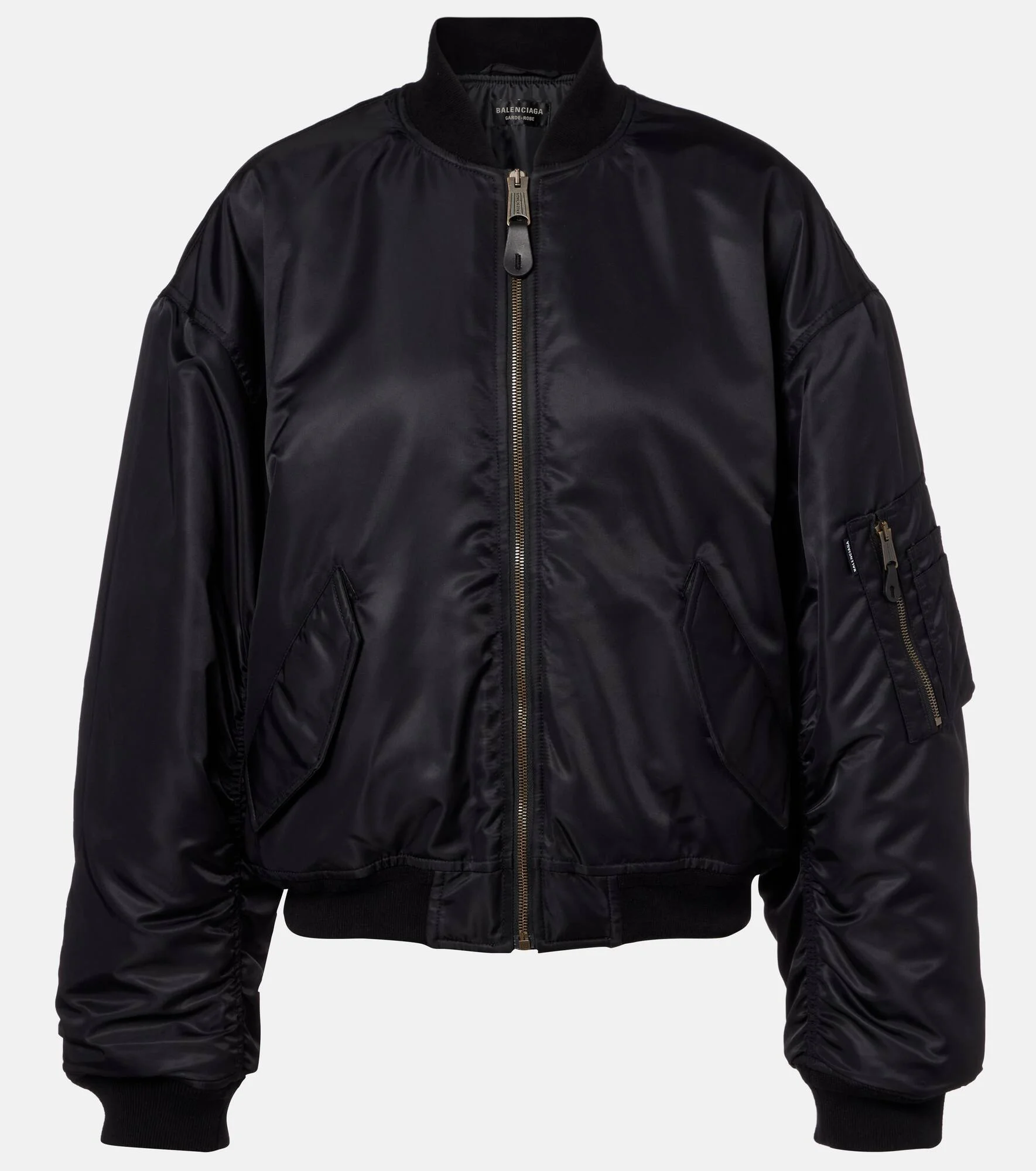 Balenciaga has evolved from the heartbeat of Paris to become one of the world’s most influential brands. The Standard bomber jacket is crafted from technical satin and is complete with ribbed trims. Product Details - Material: 100% polyamide - Care instructions: dry clean - Made in Italy - Designer color name: Black - Item color: black - Details: 100% cotton - Lining: 100% polyester - Pocket lining: 100% cotton - Filling: 60% silk, 40% polylactide - Closure: zipped front - Pockets: snap-buttoned pockets, sleeve pocket - Cuff: ribbed - Hem: ribbed - Item number: P01092734 Size & Fit - True to size - Dropped shoulders - Oversized - Non-stretchy fabric - Falls to the hip - The model seen in the picture is 178cm-5'10" and wearing a size XS