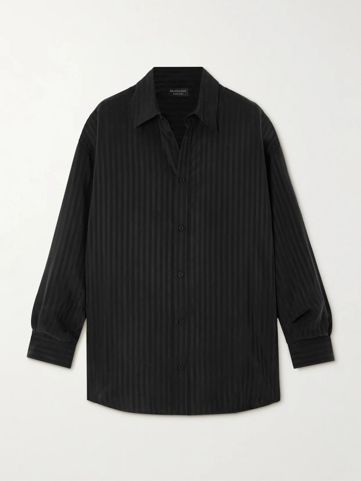 Balenciaga's shirt is made from satin that's jacquard-woven with matte stripes, creating subtle contrast and a chic, elongating effect. It's designed for a loose fit emphasized by dropped shoulder seams and has a lightweight handle and fluid drape.