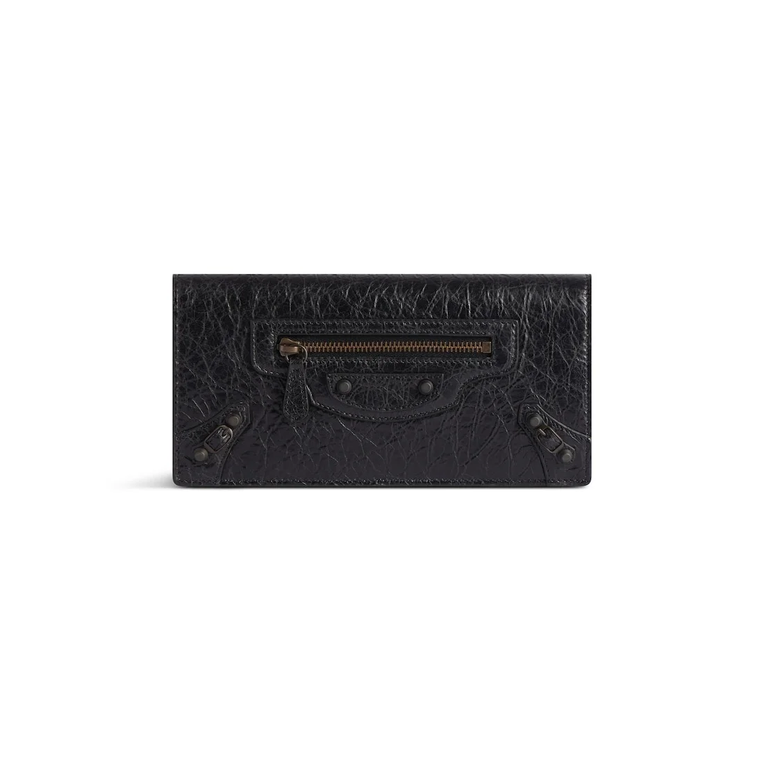 Le City Money Long Wallet in black Arena Storico lambskin PRODUCT DETAILS • Dimensions: L7,4 x H3,9 x W0,7 inch • Arena Storico lambskin • Long Wallet • Balenciaga logo debossed tone-on-tone at back • Brass hardware • Snapped flap closure • 1 inner zipped coin pouch • 1 inner bill pocket • 12 card slots • Made in Italy Material: lambskin