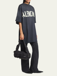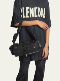 Balenciaga "Superbusy" shoulder bag in washed denim cotton Shoulder strap with two flap pouches Zip top closure Exterior, two flap pouches, three zip pouches, one slip pocket, and one zip pocket Approx. 5.1"H x 14.6"W x 4.7"D Wipe clean Made in Italy