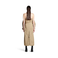 Suspended Trench Dress in beige cotton twill is from look 20 of Balenciaga Winter 24 Collection. PRODUCT DETAILS • Cotton twill • Trompe l'oeil construction: Trench seems suspended by the neck while it's a dress • 2 ways to wear • Zip at back • Trench details: collar, sleeves, shoulder button plackets, belted cuffs, waist belt, buttons, • Open back • Slit with button placket at back • Made in Italy Main material: 100% cotton - Lining: 100% cupro - Contains non-textile parts of animal origin