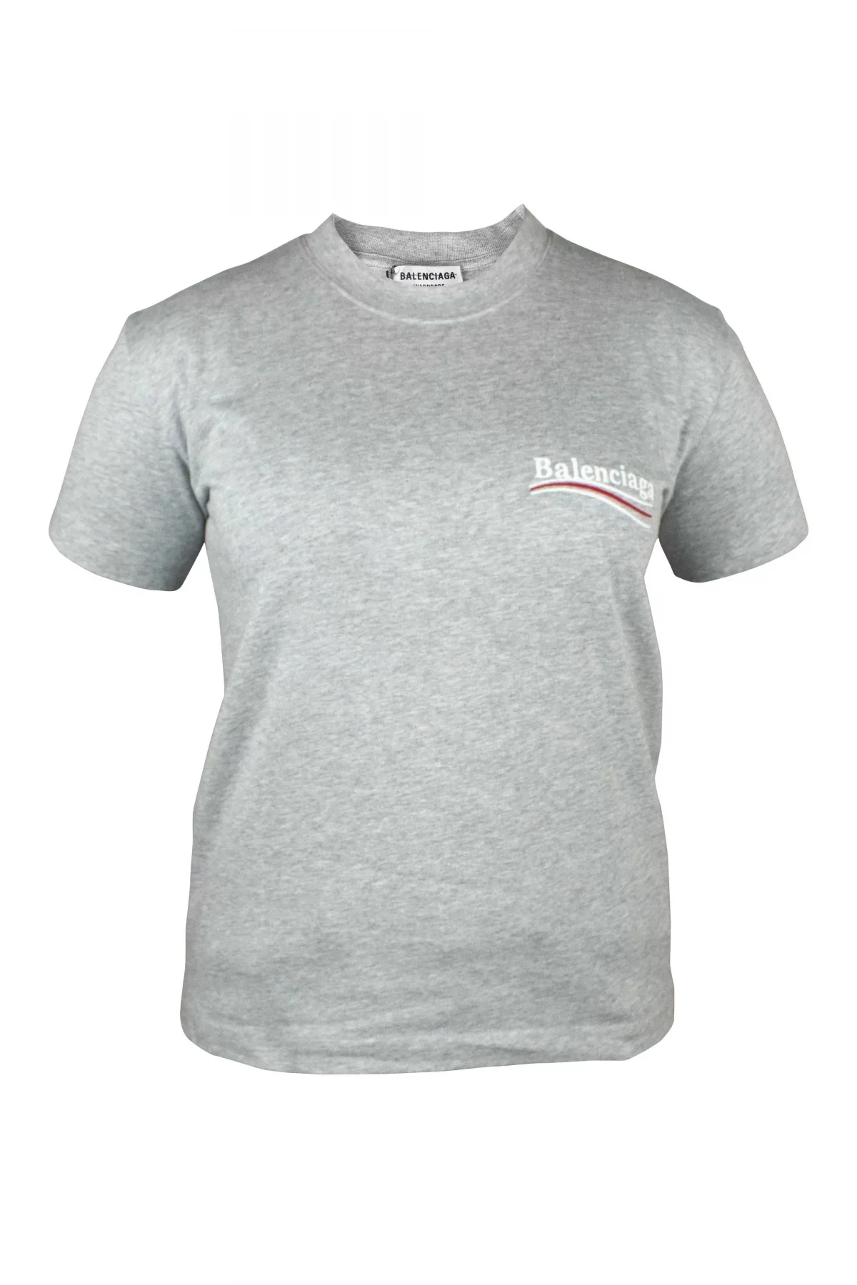 Grey Balenciaga T-shirt. White Balenciaga logo embroidered on chest. Oversized model. Short sleeves. White logo embroidered on back. Round collar. 100% cotton.