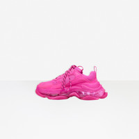 Triple S Clear Sole Sneaker in pink double foam and mesh PRODUCT DETAILS Composition: 55% Polyester, 45% Polyurethane - 100% non leather sneaker - Complex 3-layered outsole, Clear Sole technology - TPU injected inside the sole creating an air bubble for more comfort, a lighter shoe and a shock absorber effect - Embroidered size at the edge of the toe - Embroidered logo on the side - Embossed logo in the back - Triple S rubber branding on the tongue - 2 laces loops including 1 functional - Athletic lacing system featuring 12 fabric eyelets - Bicolor laces recalling hiking boots’ laces - Back pull-on tab and tongue pull-on tab - Washed effect for a well-worn look - 1 additional pair of laces included - Made in China - Wipe with a soft cloth - The item comes with a Balenciaga dustbag and box