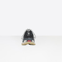 Triple S Sneaker in black, white and red calfskin, lambskin and mesh PRODUCT DETAILS Composition: 60% Polyester, 25% Calfskin, 15% Lambskin - Calfskin, lambskin and mesh - Complex 3-layered outsole - Embroidered size at the edge of the toe - Embroidered logo on the side - Embossed logo in the back - Triple S rubber branding on the tongue - 2 laces loops including 1 functional - Athletic lacing system featuring 12 fabric eyelets - Bicolor laces recalling hiking boots’ laces - Back pull-on tab and tongue pull-on tab - Washed effect for a well-worn look - Made in China - Wipe with a soft cloth - The item comes with a Balenciaga dustbag and box