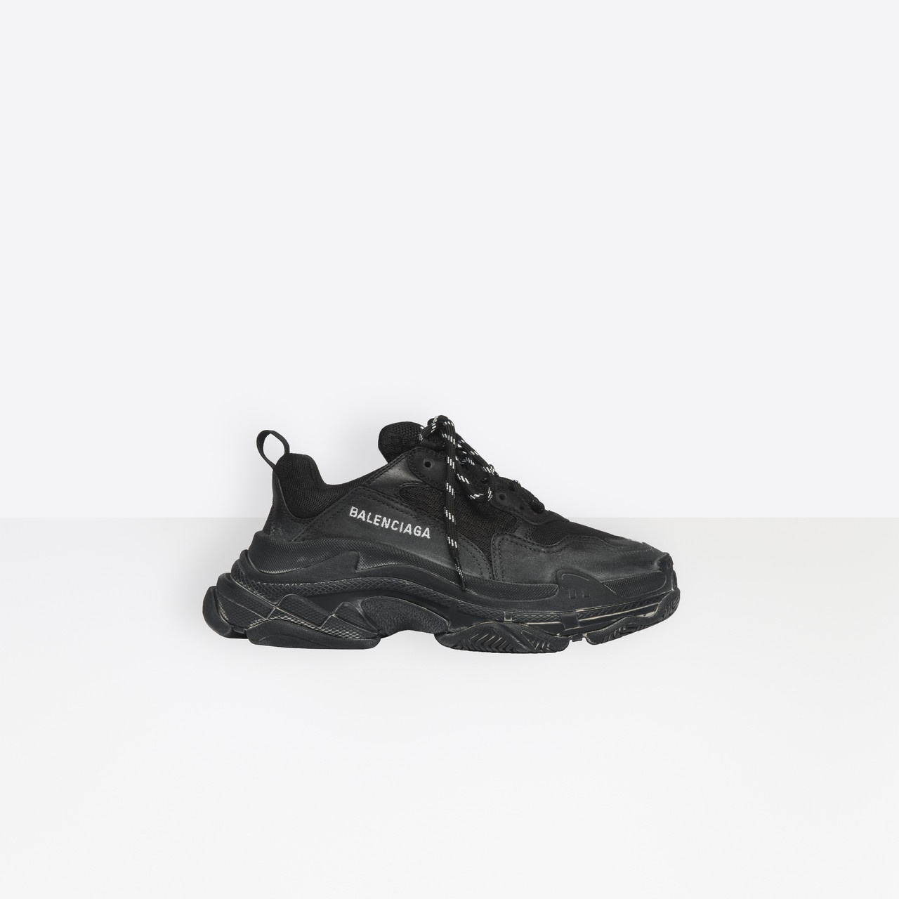 Triple S Sneaker in black calfskin, lambskin et mesh PRODUCT DETAILS Composition: 60% Polyester, 25% Calfskin, 15% Lambskin - Calfskin, lambskin and mesh - Complex 3-layered outsole - Embroidered size at the edge of the toe - Embroidered logo on the side - Embossed logo in the back - Triple S rubber branding on the tongue - 2 laces loops including 1 functional - Athletic lacing system featuring 12 fabric eyelets - Bicolor laces recalling hiking boots’ laces - Back pull-on tab and tongue pull-on tab - Washed effect for a well-worn look - Made in China - Wipe with a soft cloth - The item comes with a Balenciaga dustbag and box