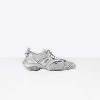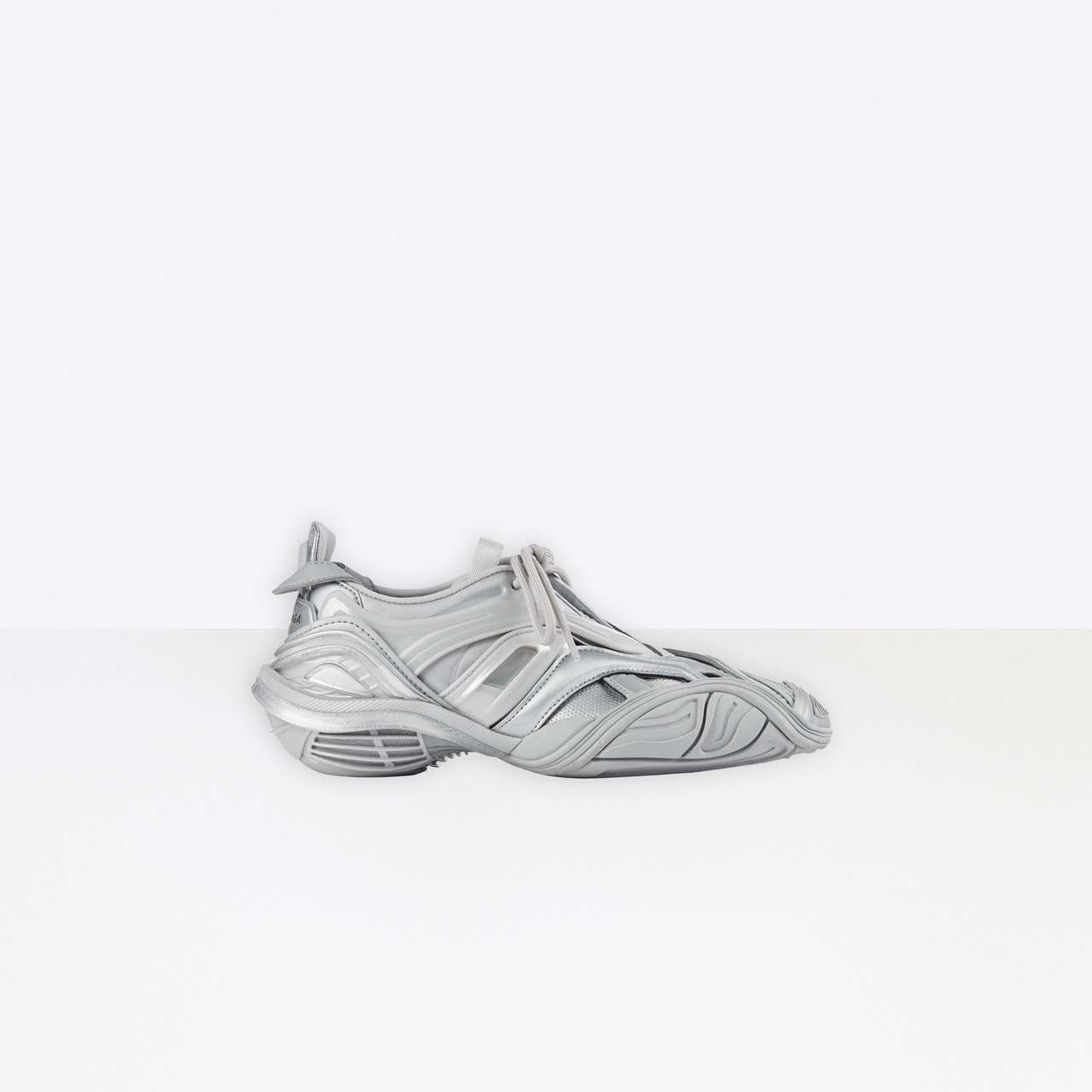 Tyrex in silver molded polyurethane, technical polyester and nylon mesh PRODUCT DETAILS Composition: 60% Polyurethane, 28% Polyester, 12% Nylon - 100% leather free sneaker - Made of polyurethane, polyester and nylon - Squared curved toe - Tyrex rubber logo on the toe - Multiple overlayed textured panels - Elastic bands on the tongue - Tongue pull-on tab - Back pull-on foam panel - 2 lacing openings - 1 pair of round nylon laces - Embossed logo at counter back - Debossed size at the heel’s back - Molded sole unit - Round honeycombed heel - Foam insole - Made in China - Wipe with a soft cloth - The item comes with a Balenciaga dustbag and box