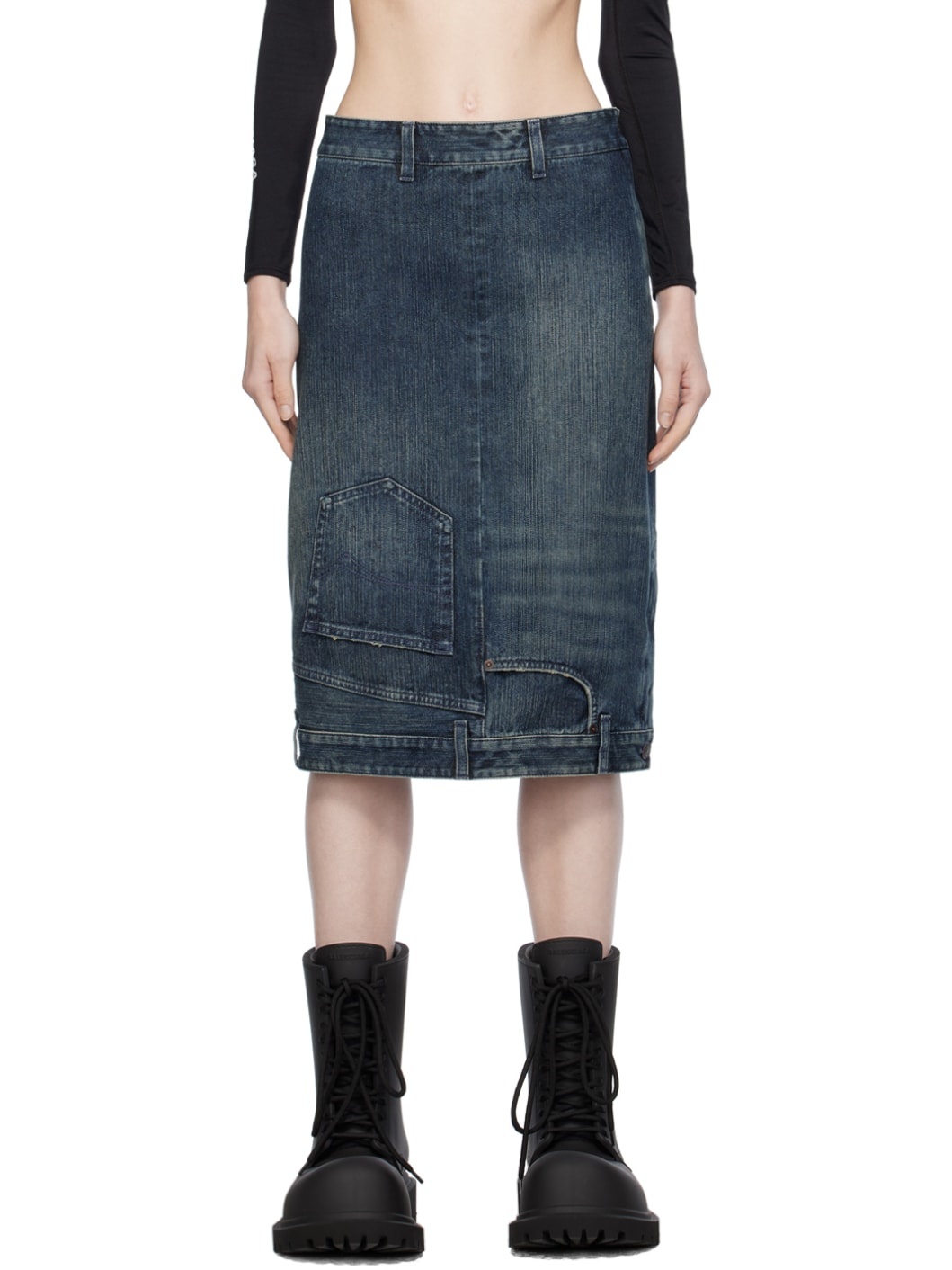 Non-stretch denim skirt. Fading, whiskering, and subtle distressing throughout. · Belt loops · Zip-fly · Patch pockets, belt loops, and zip vent at hem · Leather logo patch and patch pockets at back hem · Logo-engraved copper-tone hardware Supplier color: Dark ring