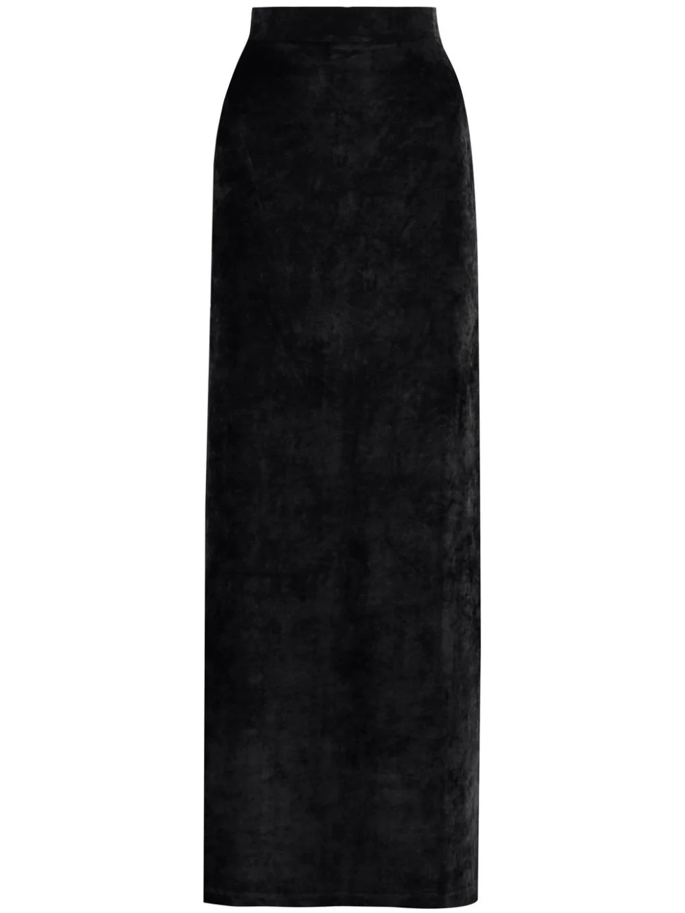 velvet-effect high-waisted skirt Highlights - Black - Velvet effect - High-waisted - Straight hem - Floor-length Made in Italy Composition Viscose 79%, Polyamide 19%, Elastane 2% SIZE & FIT Measurement HIPS 34.64 in(88 cm) WAIST 25.98 in(66 cm) Washing instructions Read Manufacturer Guidelines